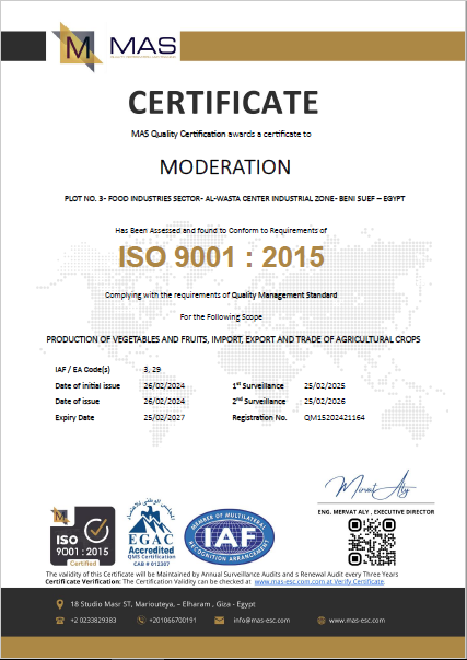 نحن نعمل وفقًا لمعايير ISO 9001:2015 لضمان إدارة جودة فعّالة في جميع جوانب عملياتنا. وتتوافق عملياتنا في إنتاج، واستيراد، وتصدير المحاصيل الزراعية مع المعايير الدولية للتميّز، والشفافية، والتطوير المستمر، بما يحقق أعلى مستويات رضا العملاء ويعزز كفاءة الأداء التشغيلي.